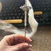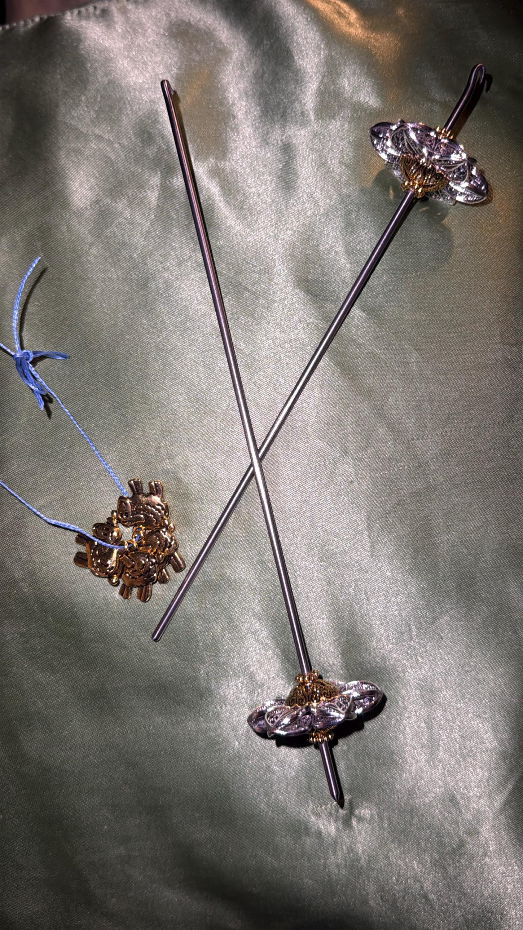 This is my version of a basic Drop Spindle - but with a bit of added flair. The whorl is made from two silver plated metal/alloy floral filigree pendants that have been specially prepared to be used as a whorl, which is adorned (top and bottom sides) with two silver or gold plated alloy bead caps and color matched findings. The shaft is hand-made from a RAW/UN-COATED high-carbon spring steel with a heat forged hook . All parts are mounted with industrial 2-part epoxy and all edges/joints have been meticulously epoxy glued to assure your fiber will not get caught in the jewelry pieces. It is my lightest weight drop spindle and has a very well balanced and fast spin, which is perfect for spinning short and fine long staple fiber..