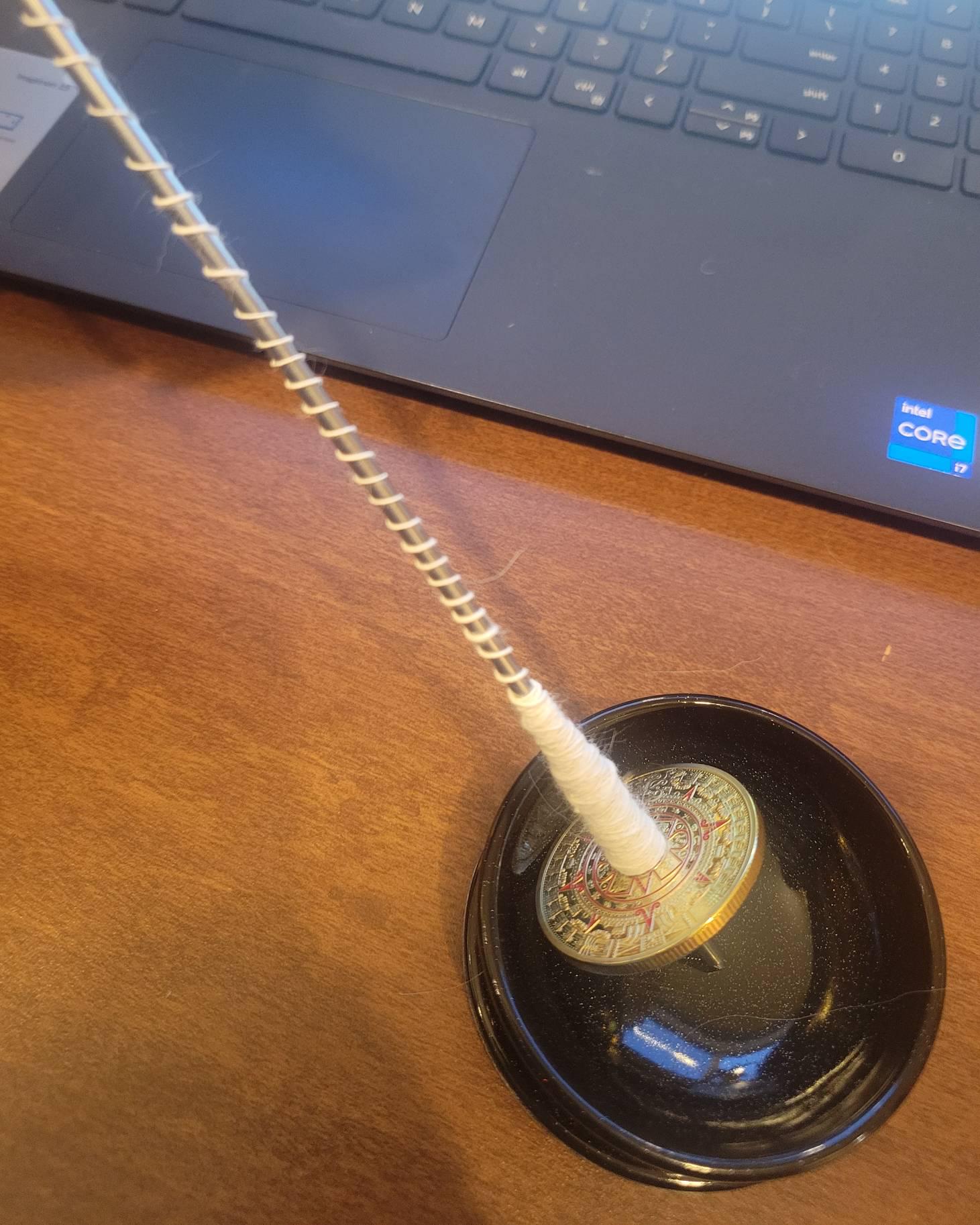 - This Tibetan Style Support Spindle is made with a finely detailed gold plated Aztec Calendar Alloy Coin Whorl. It is mounted onto a .125" (3.2mm) diameter raw/uncoated high-carbon/spring steel shaft with a heat forged hook - along with a bright silver plated pendant, a large gold plated 6-petal bead cap, and gold plated findings at top and bottom sides. This is a very well balanced heavier weight support spindle that uses the larger of the two shafts that I make and the whorl has an abundance of rim weight - so this spindle will be perfect for spinning a wide variety of finer and long staple fibers. All parts are mounted with industrial 2-part epoxy and the shaft is oil coated with a rust inhibitor spray.