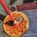 Made from 27 individual pieces, this spindle (one of two nearly identical spindles) is made from a truly unique dial - Circa 1920, labeled "Wizard - this is a Swiss made for US import pocket watch dial that was used in a variety of faked look-alike watches sold in the early 1900's. It is a 3 piece dial - made from a snap fit machine/damaskeen (or damascene) engraved gold plated cap, a deep red cellulose acetate film with yellow/gold numerals, and a copper backing - adorned with period correct watch gears, screw, and crystal rhinestones - then coated with two thick layers of epoxy resin top coat for a no-snag/long life finish. The finished dial is mounted to a real gold plated 3mm thick filigree pendant and a vintage brass clock gear for a whorl - fitted to a metallic candy apple red powder-coat painted steel shaft with a hand forged hook - finished off with real gold plated spiral beads and silver plated findings, and one polished steel winding gear and crystal for fine balancing. All components are assembled with an industrial 2-part epoxy adhesive.
