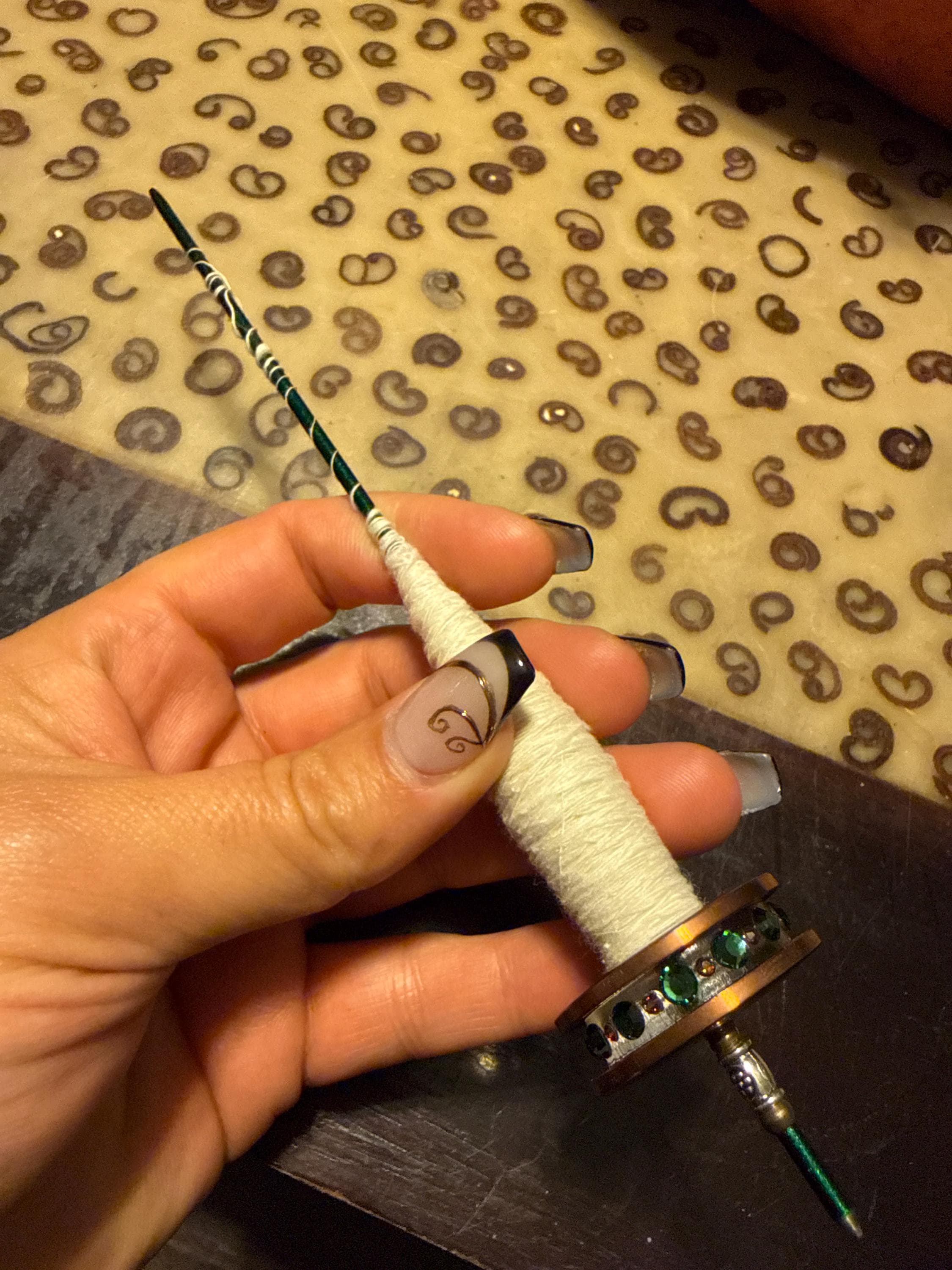 This is my latest of 3 versions of this spindle that features this gorgeous Ireland coin. The spindle is made with two bronze/copper 1968 Ireland "The Hens of Éire" 1 Penny Coins that have been tarnished, fine sanded on my lathe to reveal the coin's unique design, and coated in a thick layer of epoxy resin top coat to give it a no-snag/long life finish. The coins are bonded to a 1/4" thick acrylic disc and mounted to your choice of available steel shaft colors and adorned with gold and silver plated findings (top and bottom sides). This is a light to medium weight Tahkli style spindle and it's perfect for spinning cotton and other short and fine long staple fibers as well.