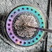 Holographic design Ion Coated Stainless Steel Filigree Pendant, Silver Filigree Caps, and Acrylic Whorl with Alloy Weight Ring - CHOICE OF 10 SHAFT COLORs - TOP OF BOTTOM WHORL