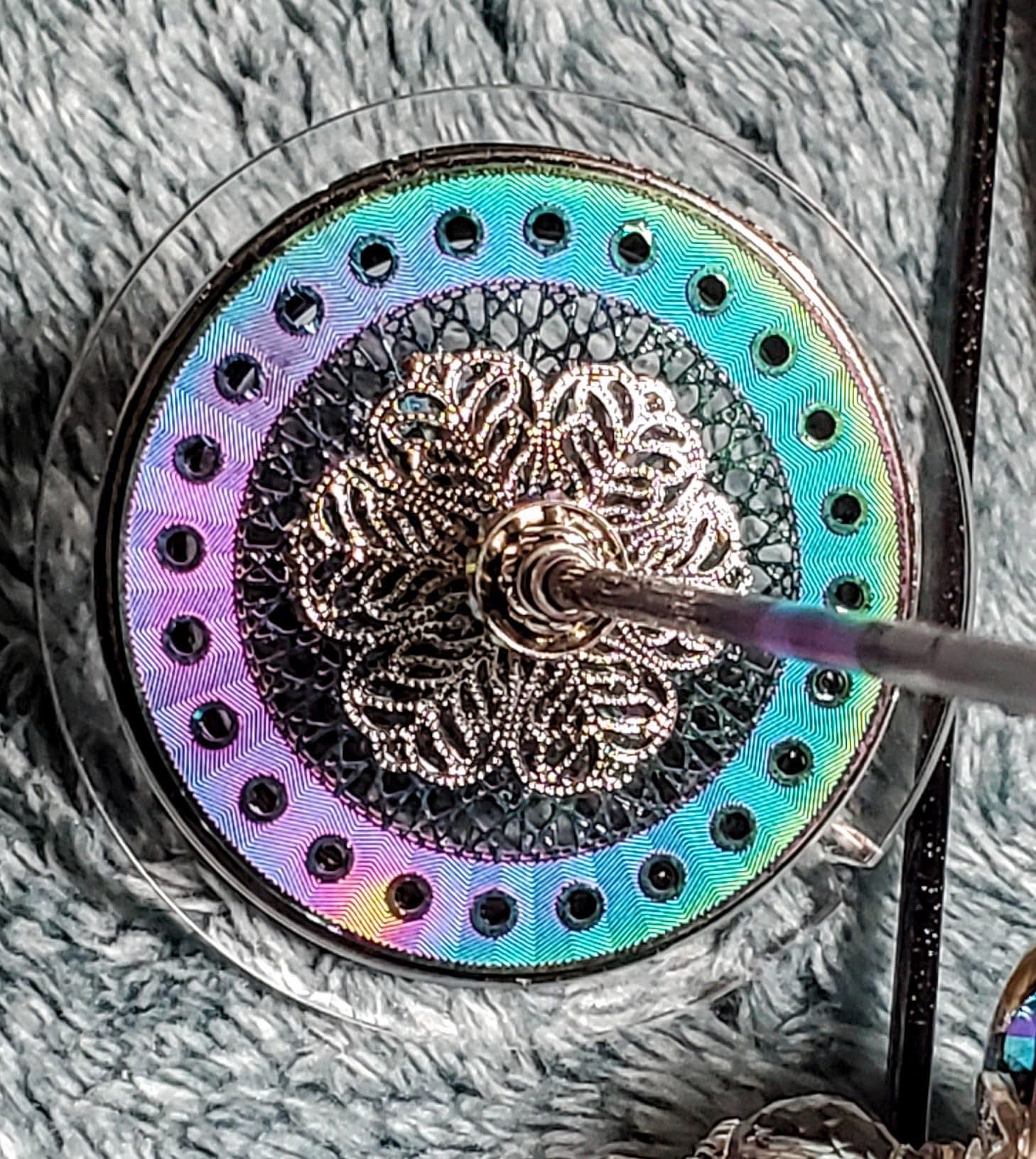 Made from a total of 18 individual pieces, this special design incorporates a 1/8" thick acrylic disc that has a groove milled into the bottom surface with a chrome plated alloy ring mounted into it that acts to add weight toward the rim of the whorl for a well balanced and longer spin. The whorl is adorned with a rainbow color ion coated stainless steel filigree pendant that is etched to produce a holographic/color changing effect, which is mounted onto the surface - along with two silver plated 6-petal filigree bead caps, 4 multi-crystal bead spacers, and silver plated + stainless steel findings - all mounted to a steel shaft in your choice of available colors. The shaft is made of high-carbon/spring steel with a heat forged hook, and it is coated with an industrial quality 2-part (color/gloss) powder coat paint, and all components are assembled with an industrial quality 2-part epoxy resin for long life