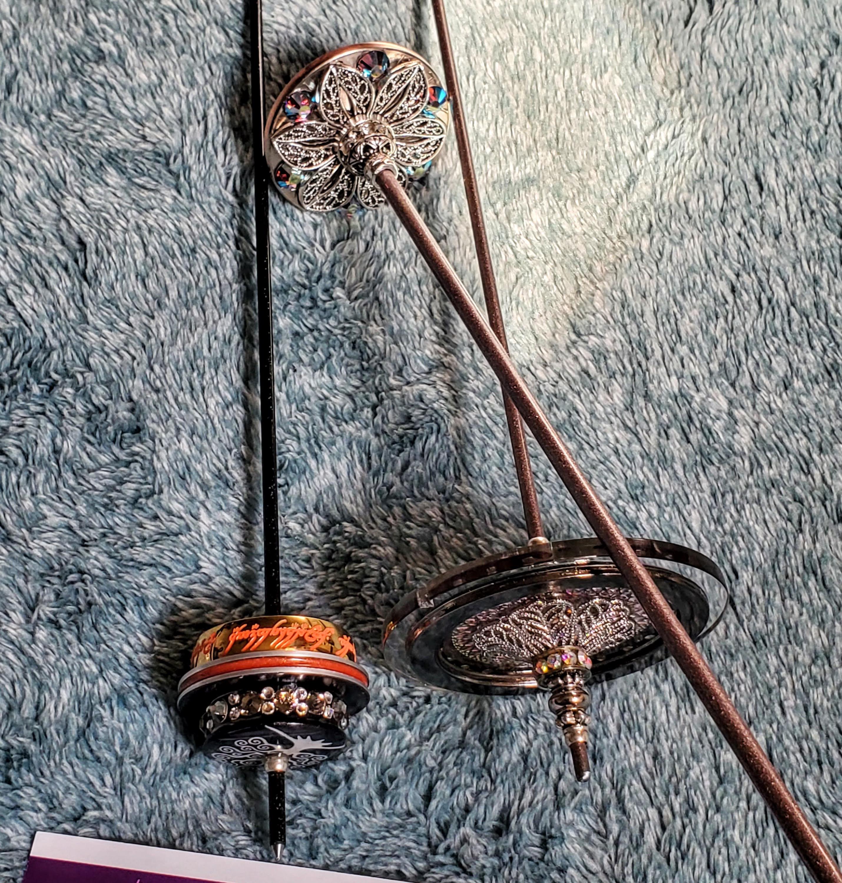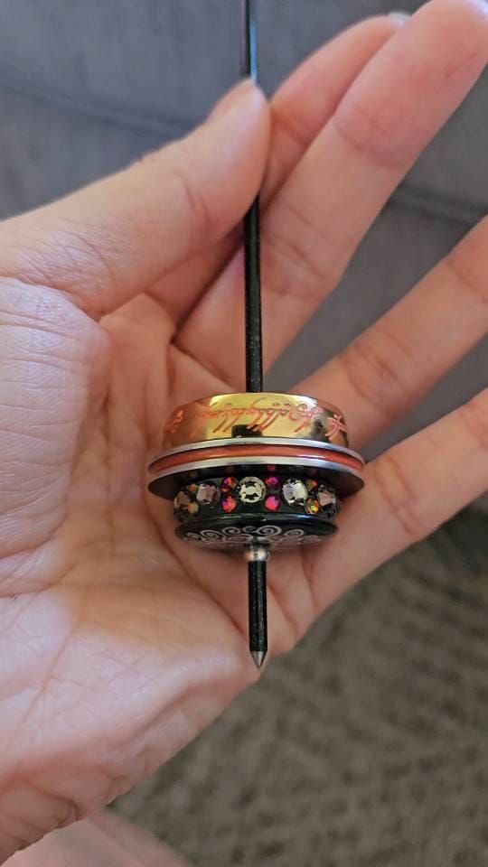 This customer requested and movie inspired spindle is one that I am quite proud of and one of the most challenging spindles I've made to date - and it spins forever - like no other! The centerpiece of this spindle is a high quality and highly polished gold plated stainless steel [the~one] ring with deep and engraving that is filled with glow-in-the-dark lettering that looks like it came right out of the fire. The whorl for this spindle is made from two acrylic discs and two black anodized aluminum discs with a Mexico 1-Peso Coin laminated in the center, The whorl is adorned with the ring mounted on top with a fire-eye print mounted within the ring - then filled with slow cure epoxy resin, and the bottom side of the whorl is adorned with a smaller diameter acrylic disc with 36 Black Diamond and Clear Preciosa (Czech) crystal rhinestones, a black painted and filled with white mica epoxy Tree-of-Life pendant that is also coated in a thick layer of slow cure epoxy resin and finished off with a silver plated finding around the shaft. These components are mounted to a Cosmic Starlight Black powder-coat-painted steel shaft with a heat forged hook and all components are assembled with 2-part epoxy adhesive.